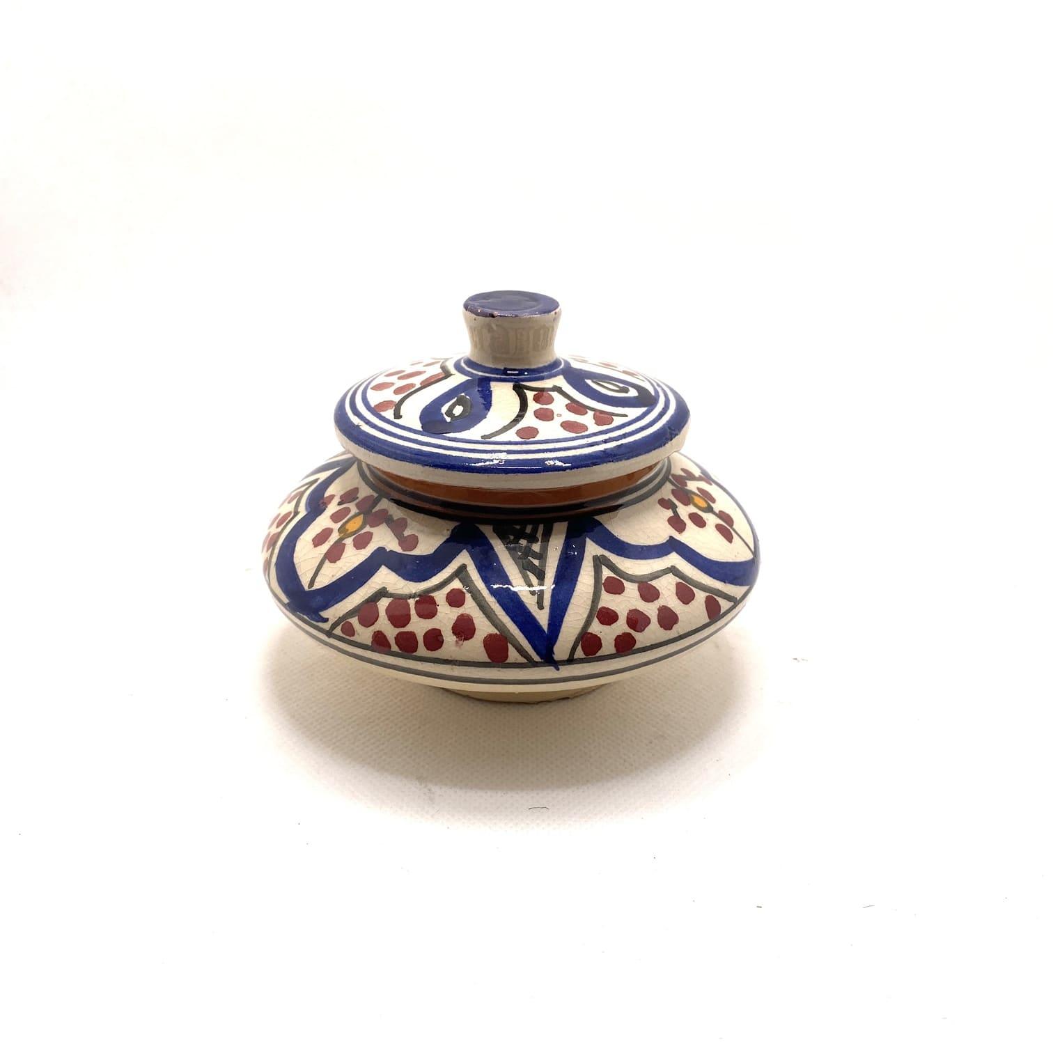 The most representative pieces of Fez pottery include plates, tagines, and teapots, used both in daily life and for special celebrations. The double-firing technique, characteristic of this city, makes the pieces more durable and gives them a distinctive luster. This pottery is a symbol of Fez's rich cultural heritage, where each piece tells a story through its decorative details.