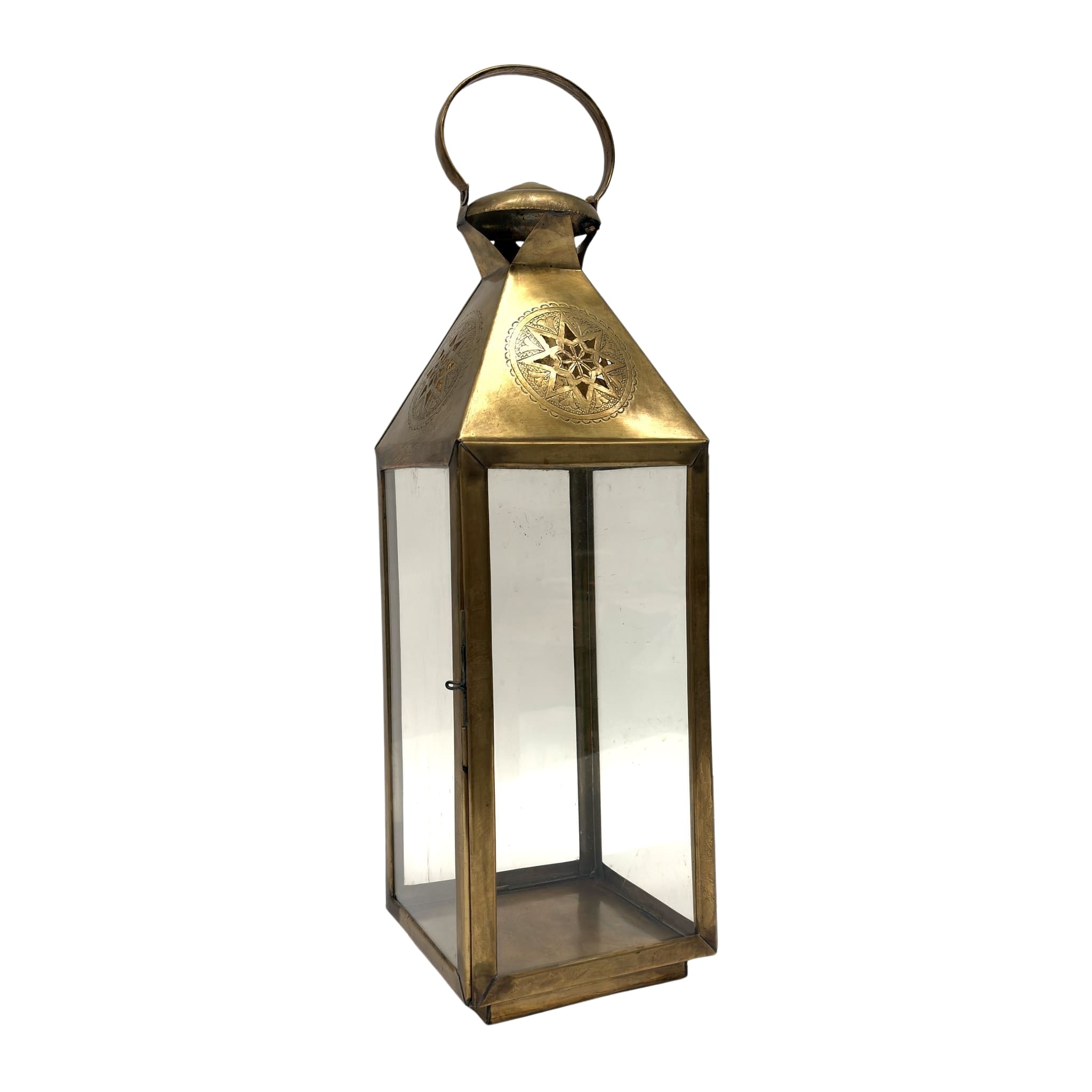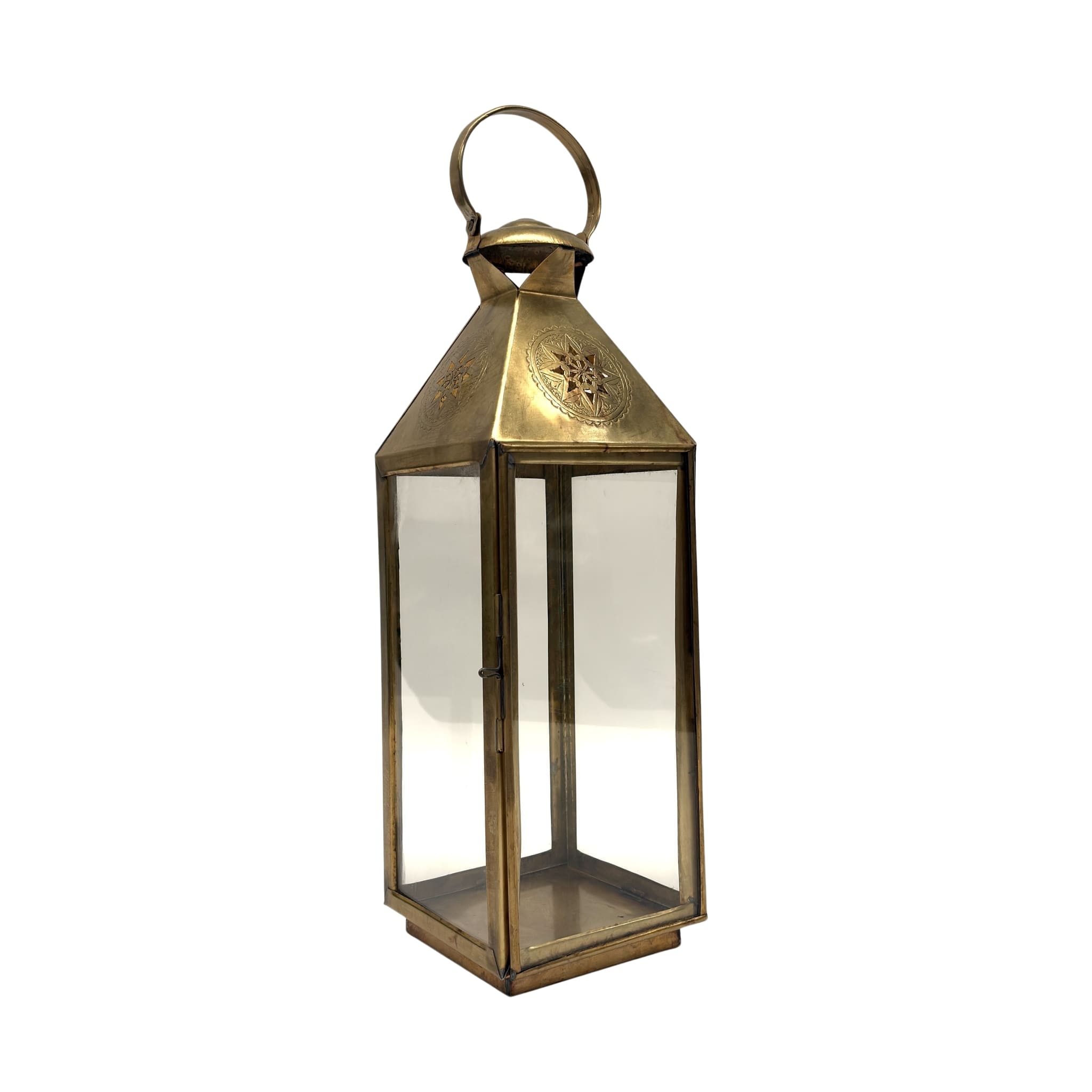 Arabian lantern in gilded copper for large candles. Handcrafted in gilded copper and clear glass, this Moroccan lantern is designed for outdoor use or to decorate and enhance the ambiance of homes, gardens, and terraces.