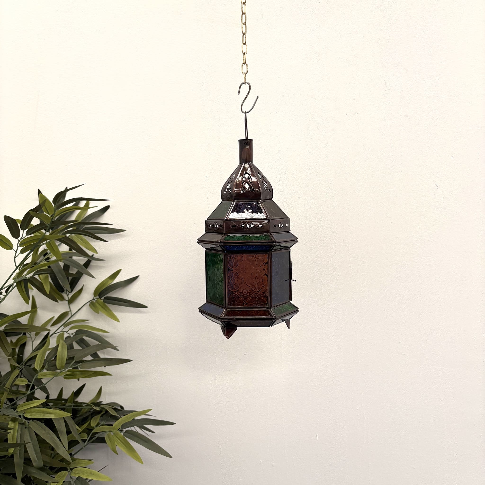This hexagonal Arabic lantern is perfect for creating a warm and inviting atmosphere in true Marrakech style. Its beautiful handcrafted glazed glass adds a touch of Al-Andalus to your favorite rooms.