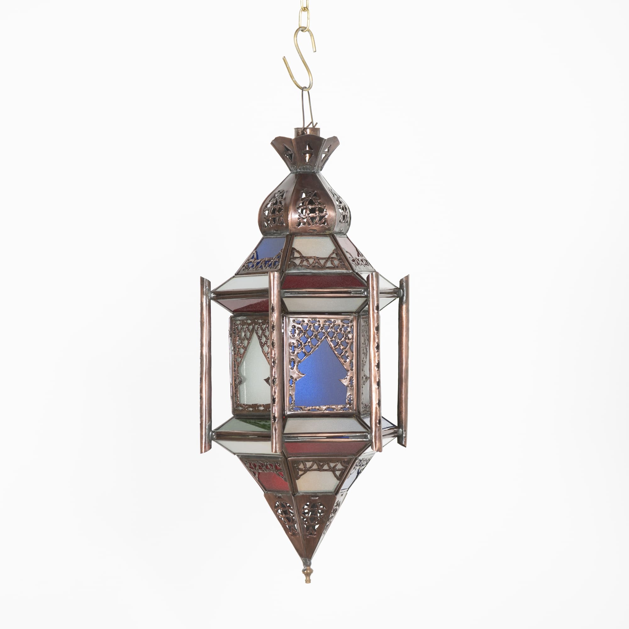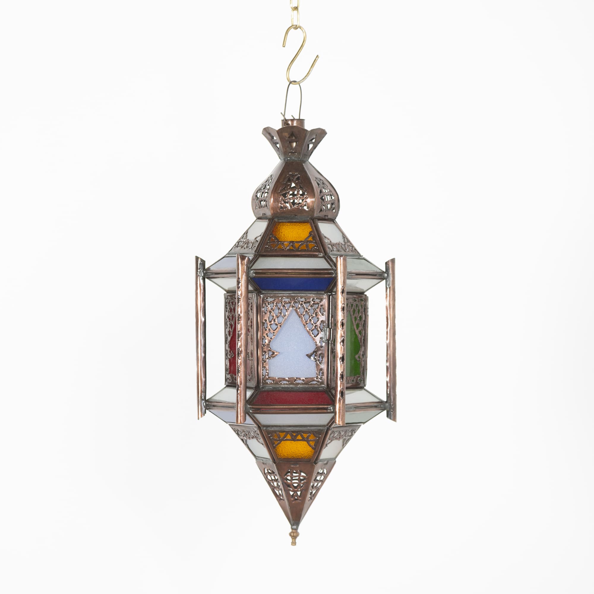 The Moroccan lamp is handmade with multicolored glazed crystals alternating with opaque white crystal, resulting in a piece that brings great vitality to your home and exteriors.