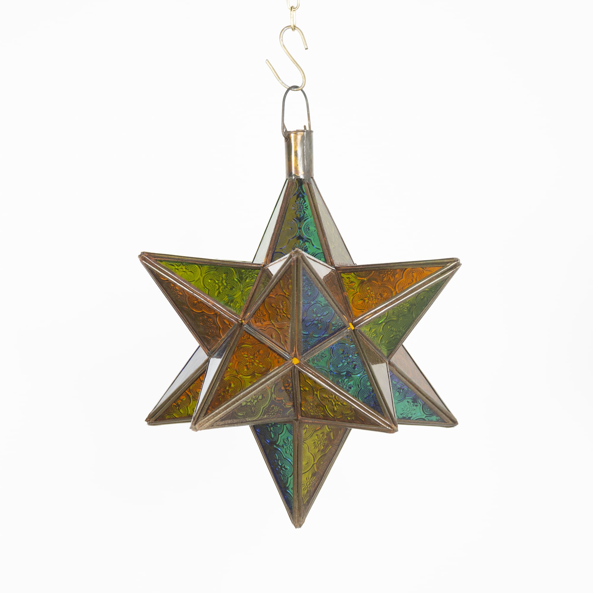 Star-shaped crystal lamp, designed to add a special touch to your favorite rooms, bedrooms, and outdoor spaces. Handcrafted with a wrought iron frame and glazed multicolored crystals, this Moroccan lamp casts a pleasant and warm light in your home.