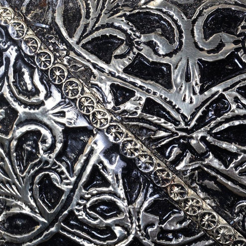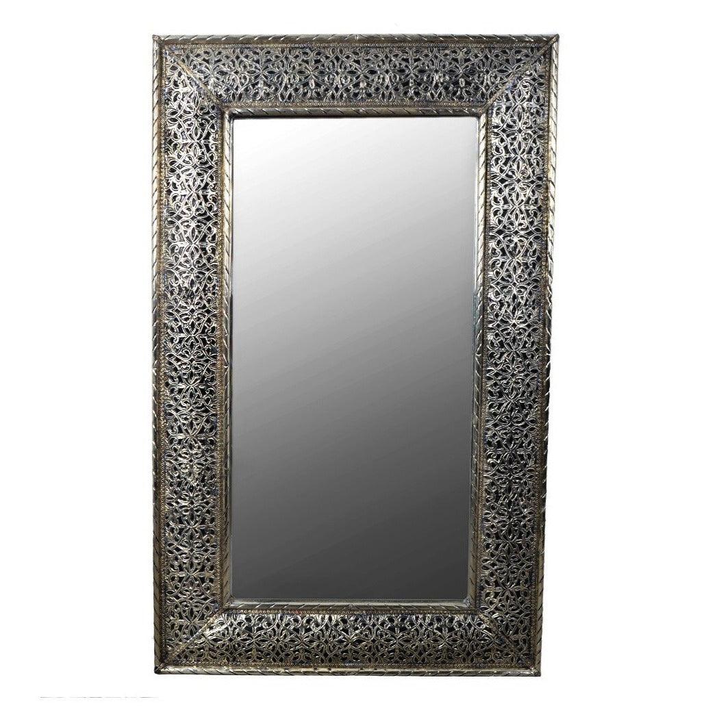 Handmade Moroccan mirror, made of wood and coated with alpaca in silver and darker black tones.