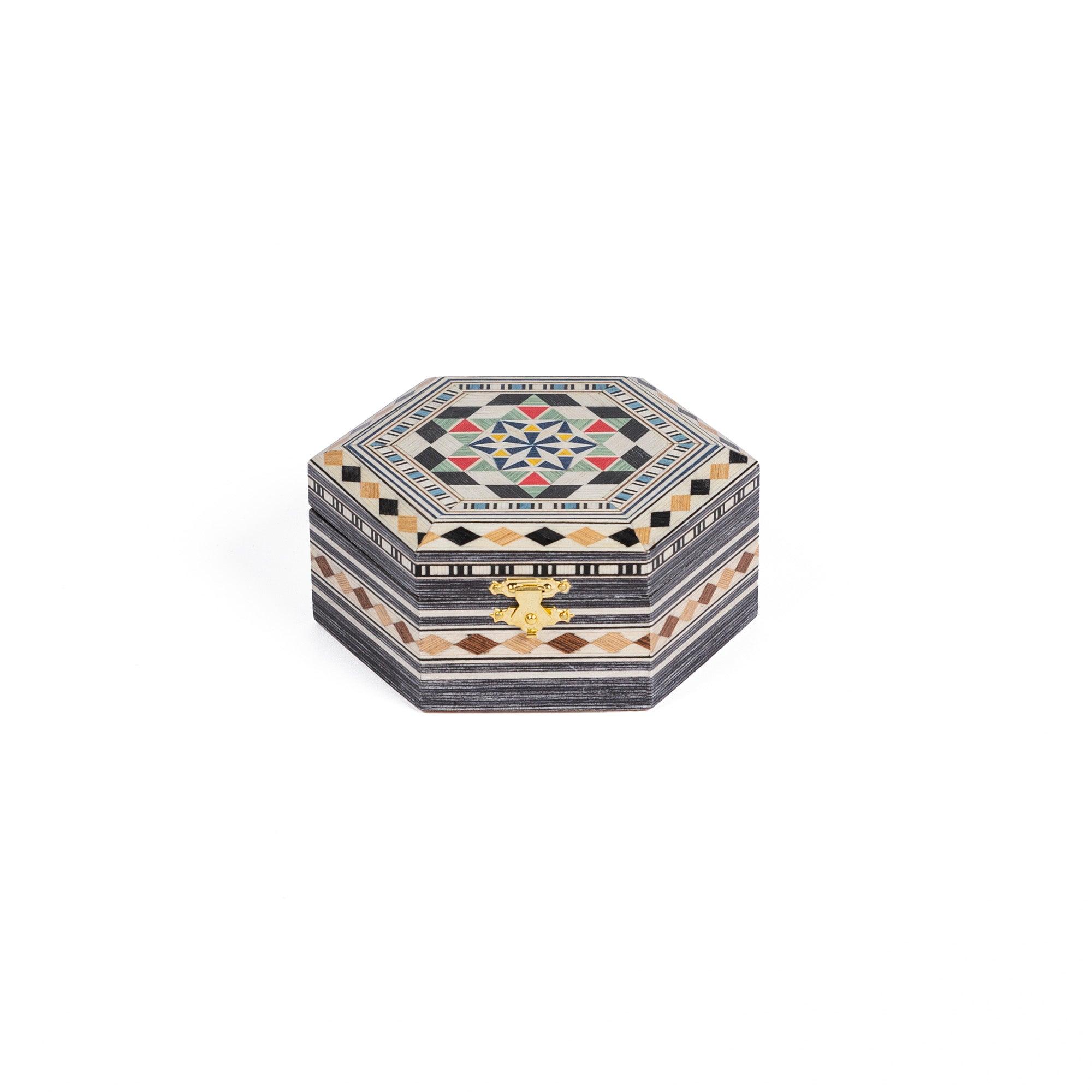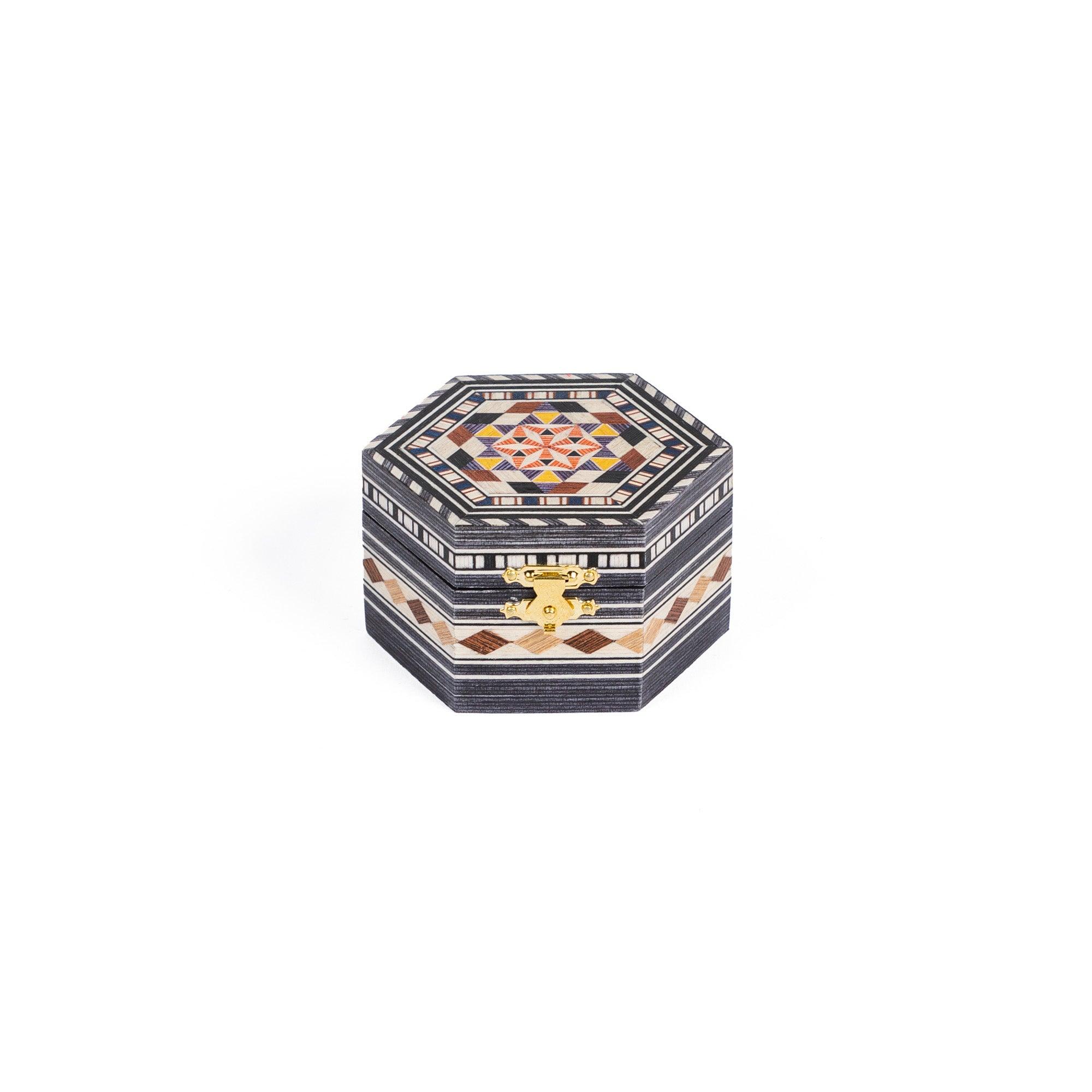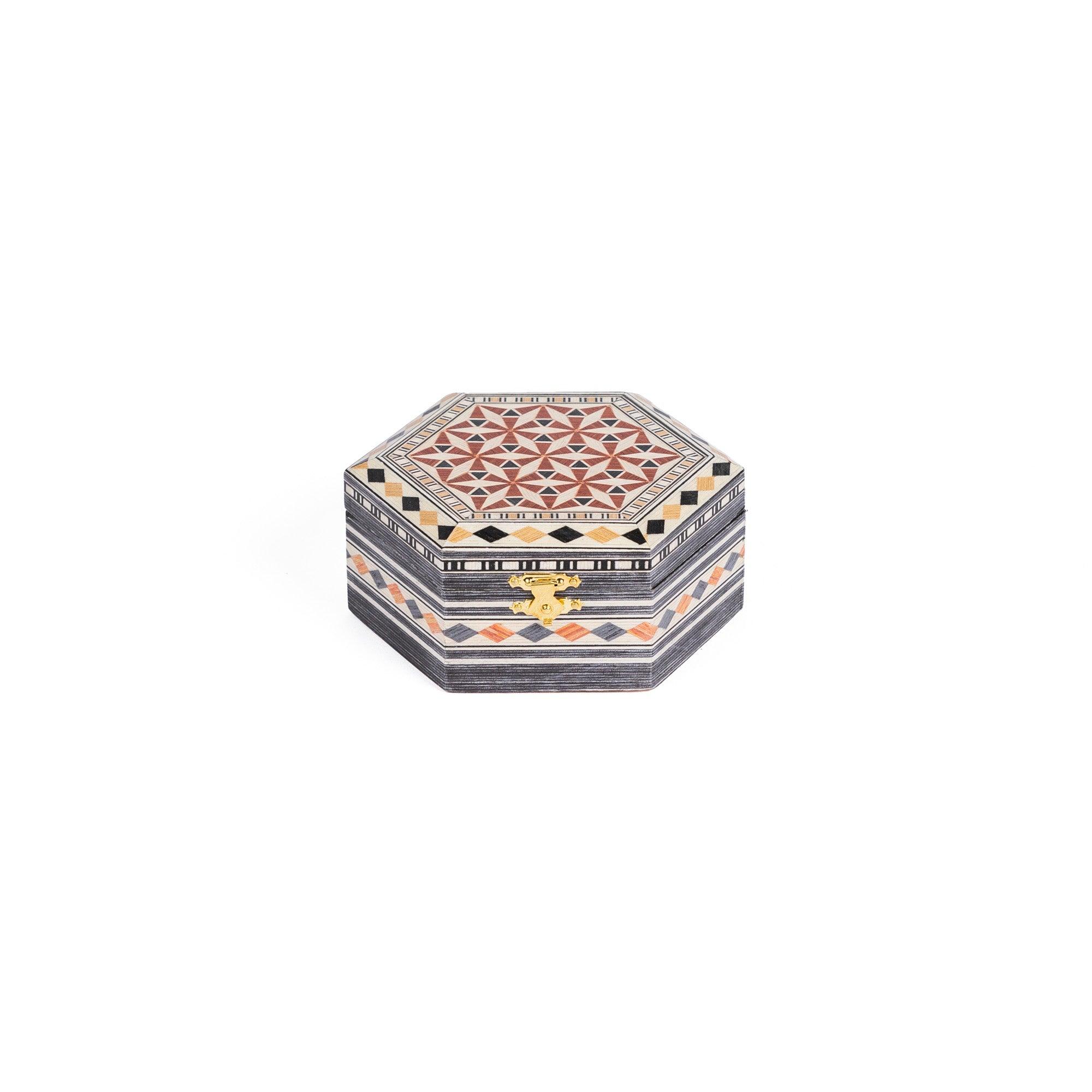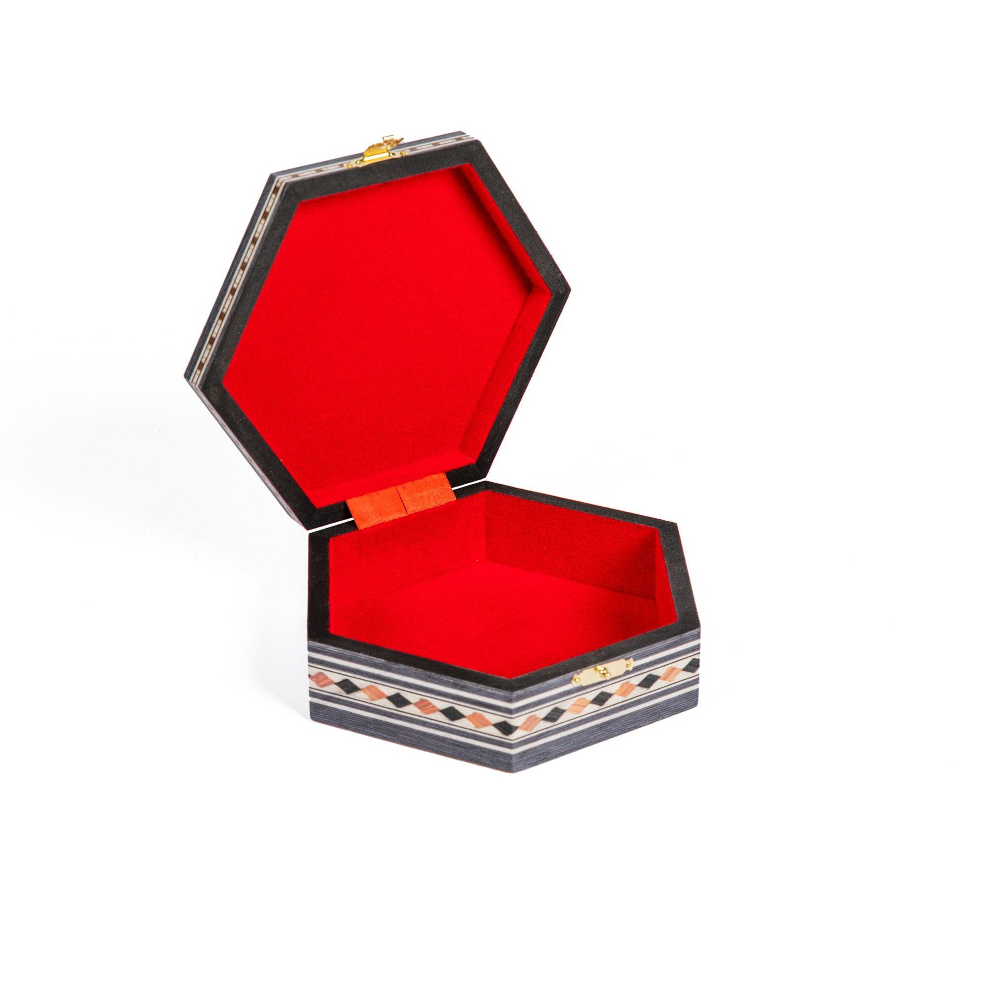 Hexagonal powder compact in Granada marquetry. Made of wood covered with hand-painted and engraved marquetry sheets. The interior is lined with elegant, soft red velvet.