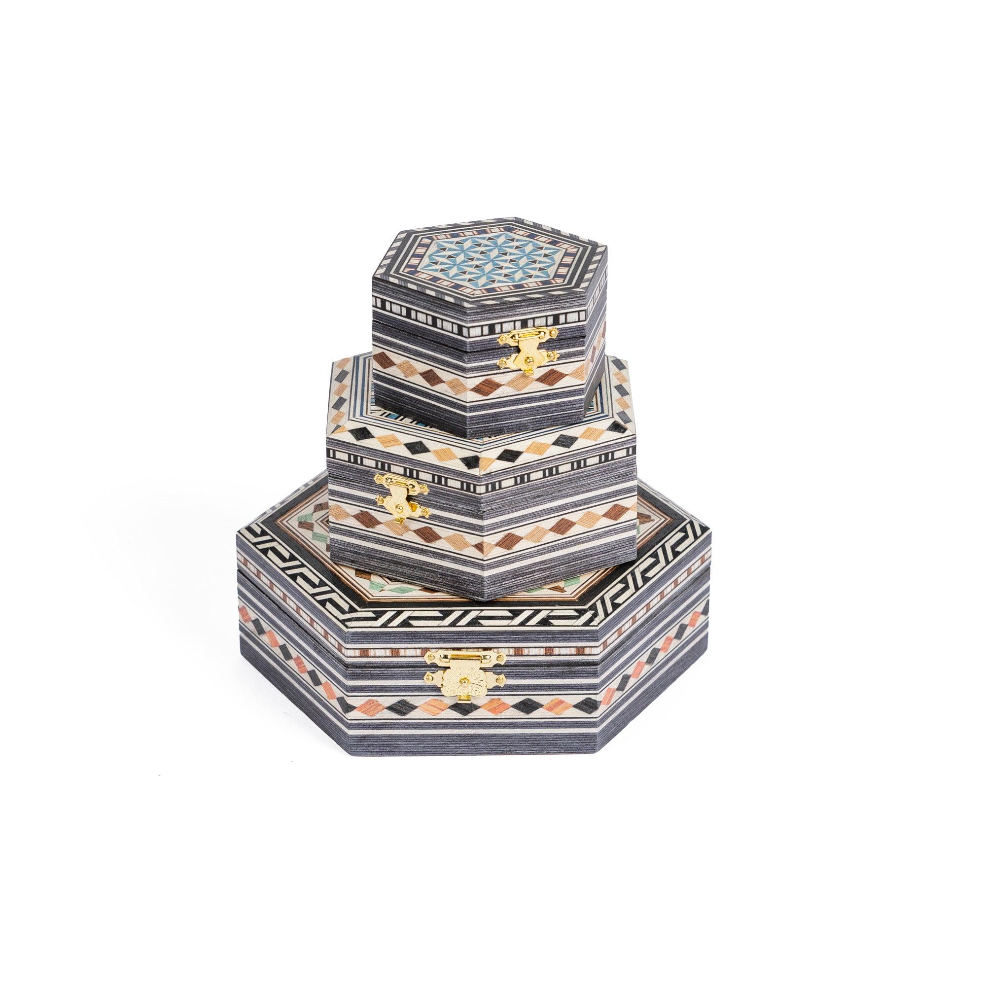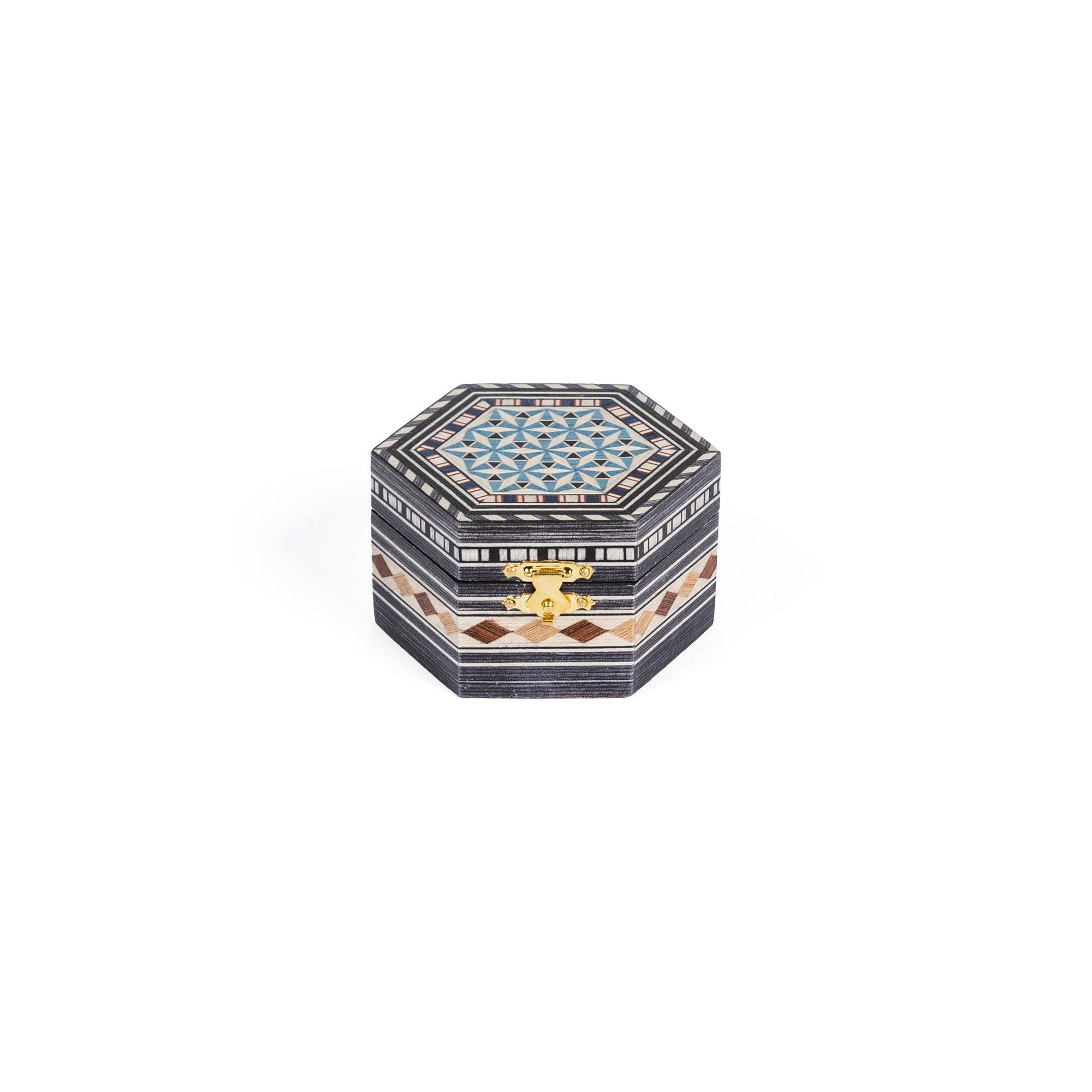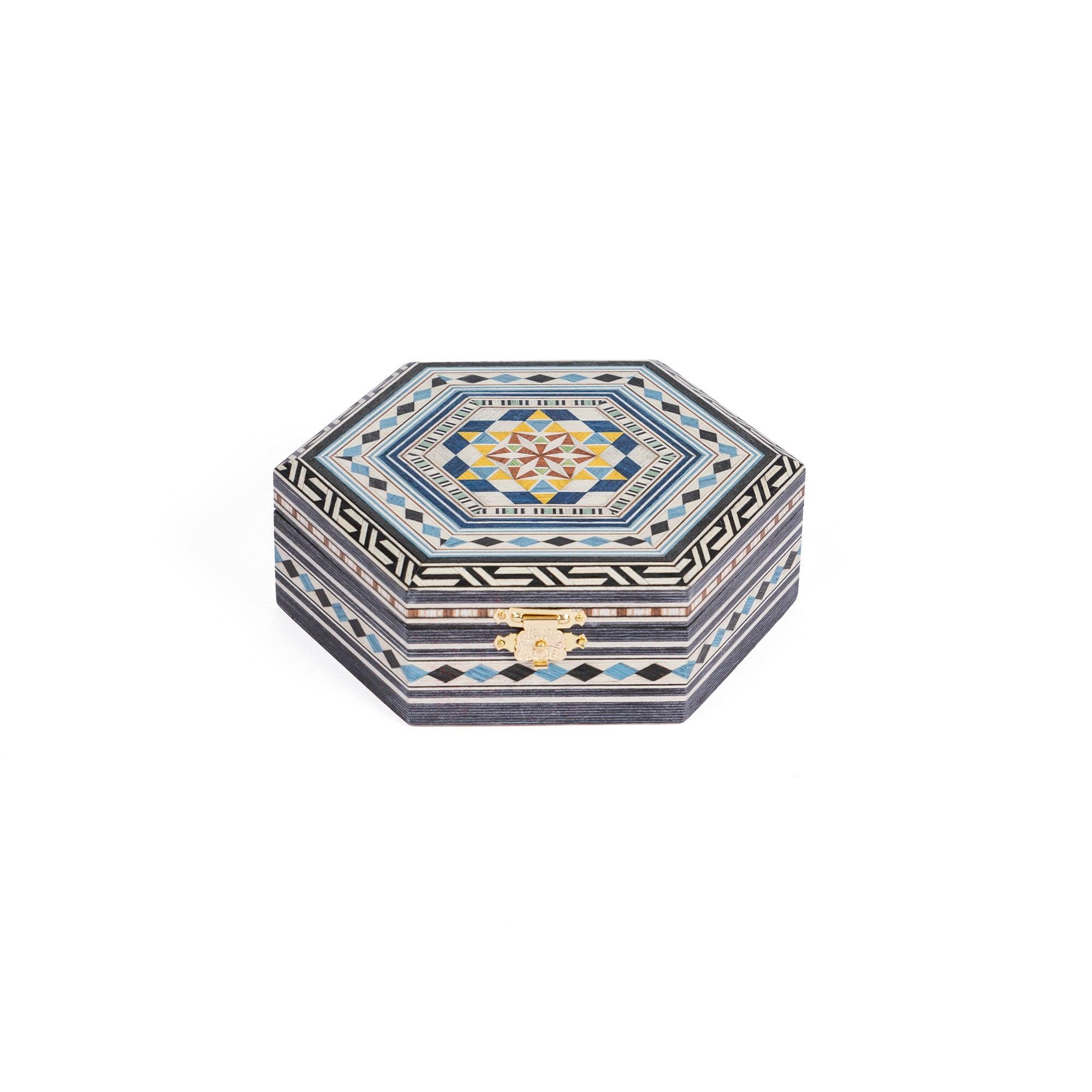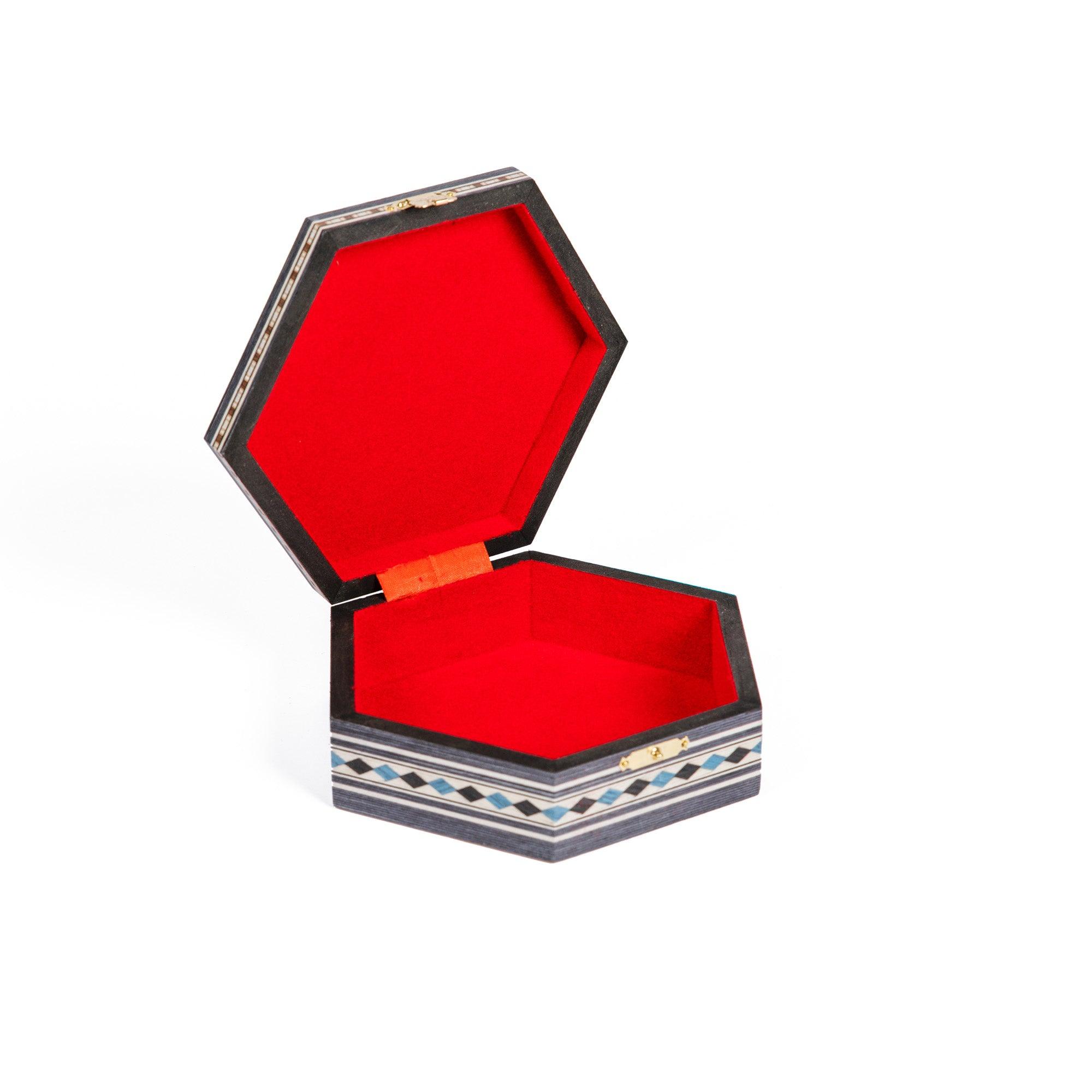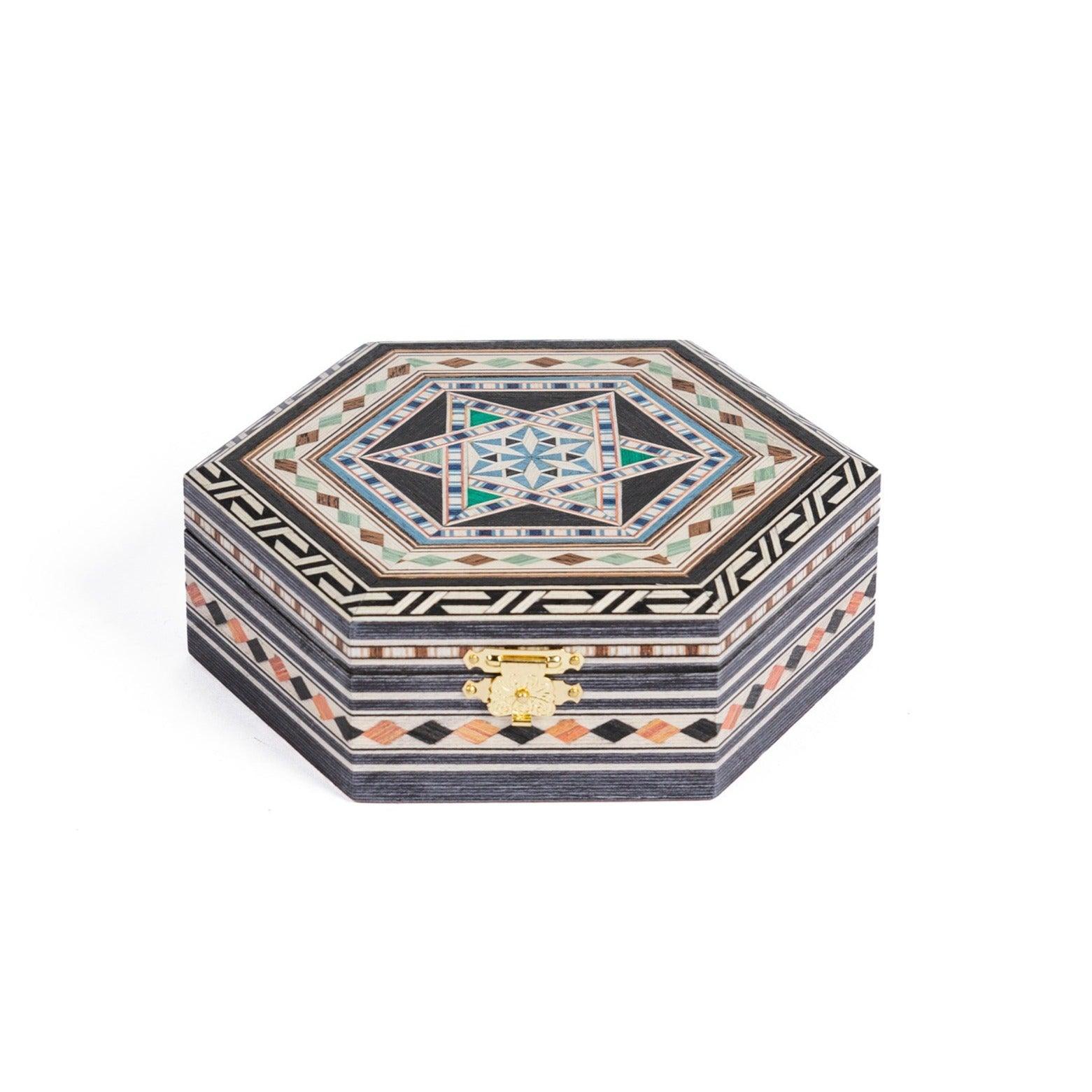 Hexagonal powder compact in Granada marquetry. Made of wood covered with hand-painted and engraved marquetry sheets. The interior is lined with elegant, soft red velvet.