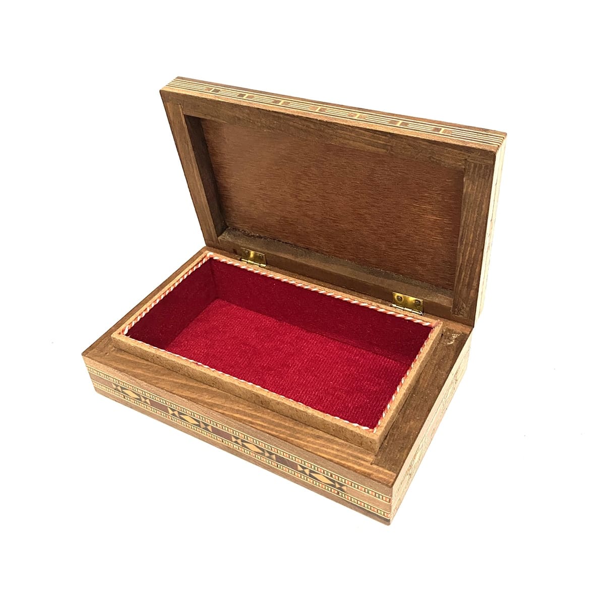 100% handmade in wood marquetry and lined in garnet Damask velvet.