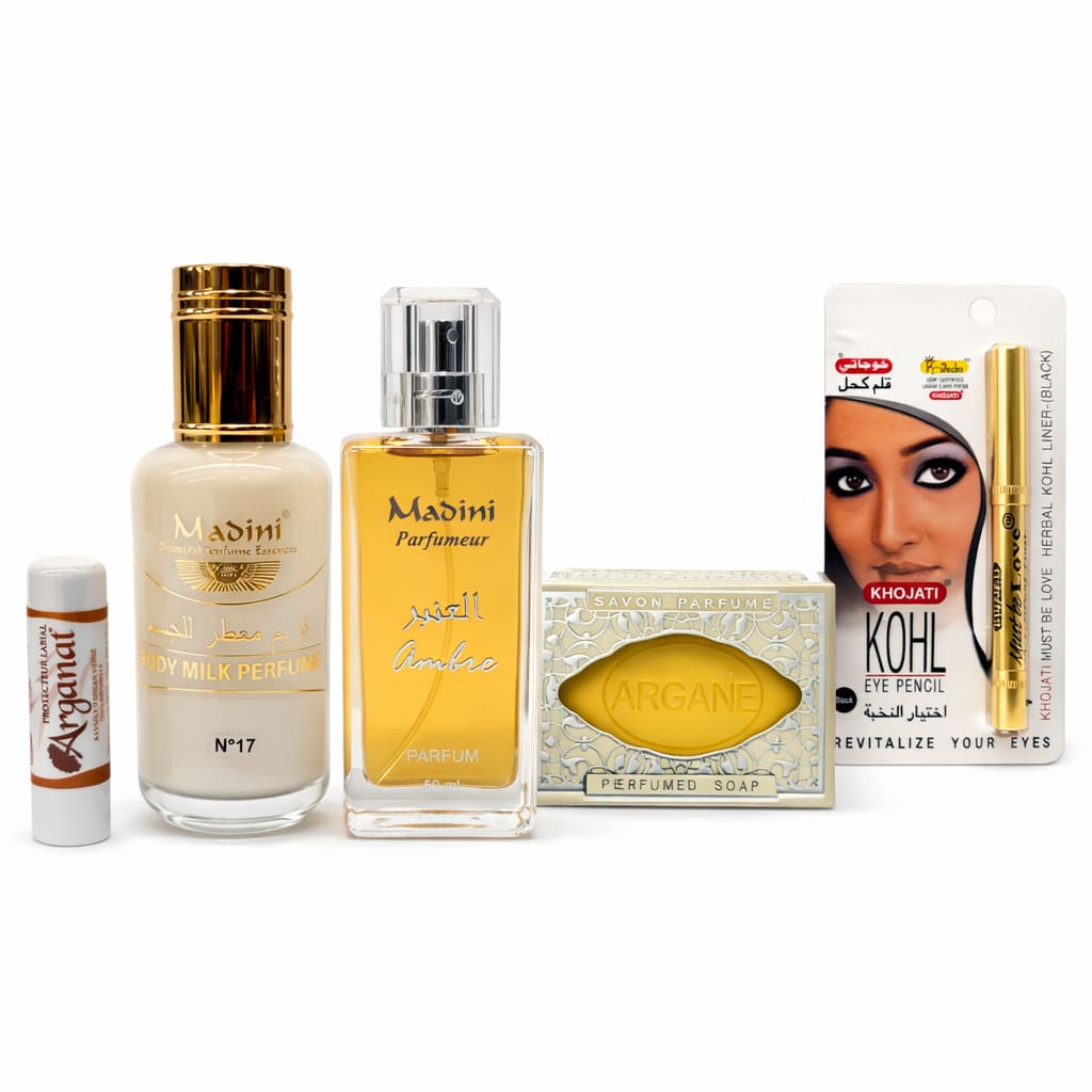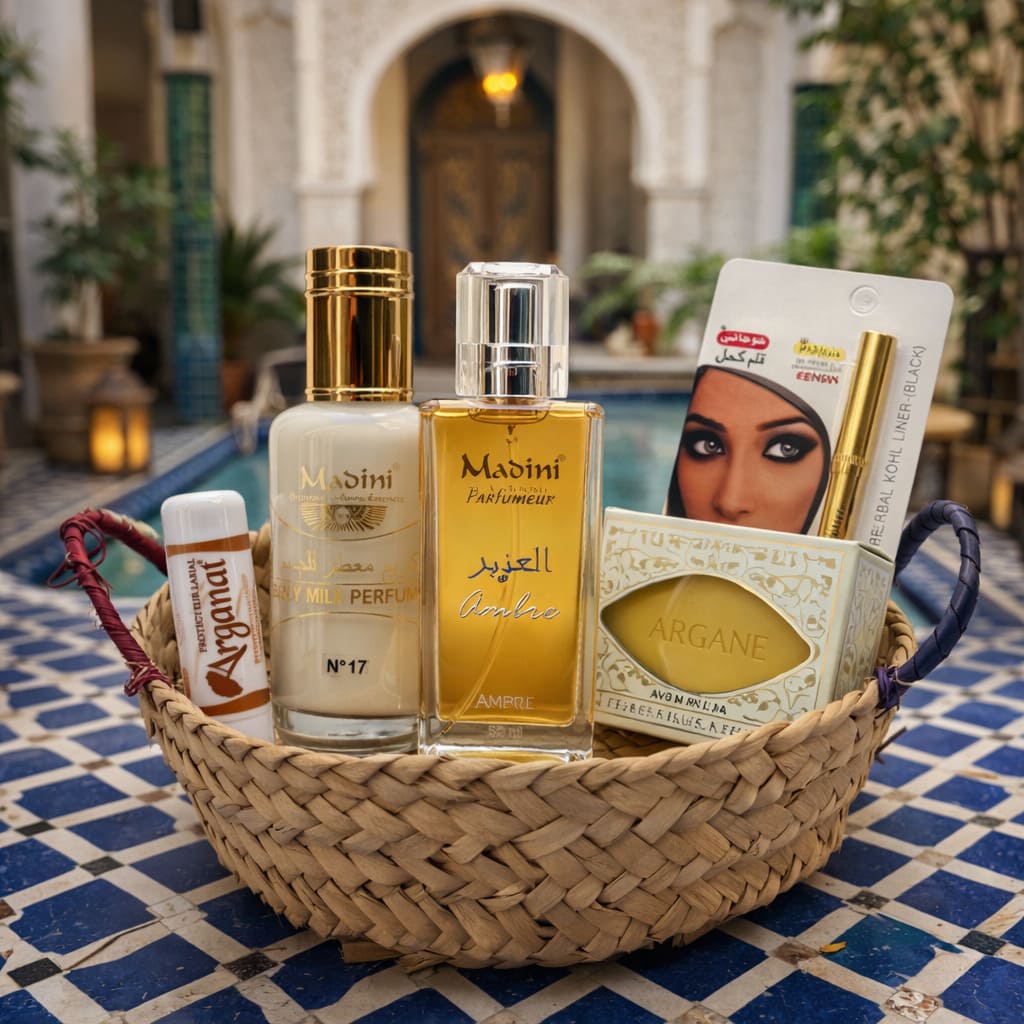 MADINI Arabic cosmetics basket, consisting of 50ml amber artisan perfume, 100ml perfumed body milk, ARGANAT lip balm, 125g MADINI artisan argan soap bar and Arabic kohl eyeliner.