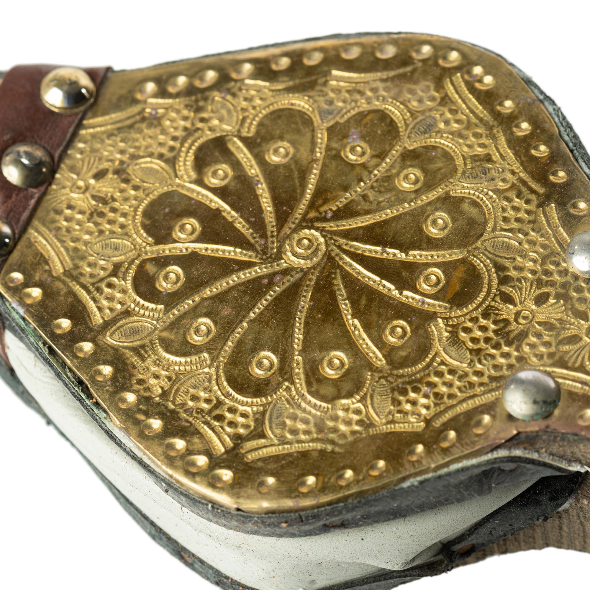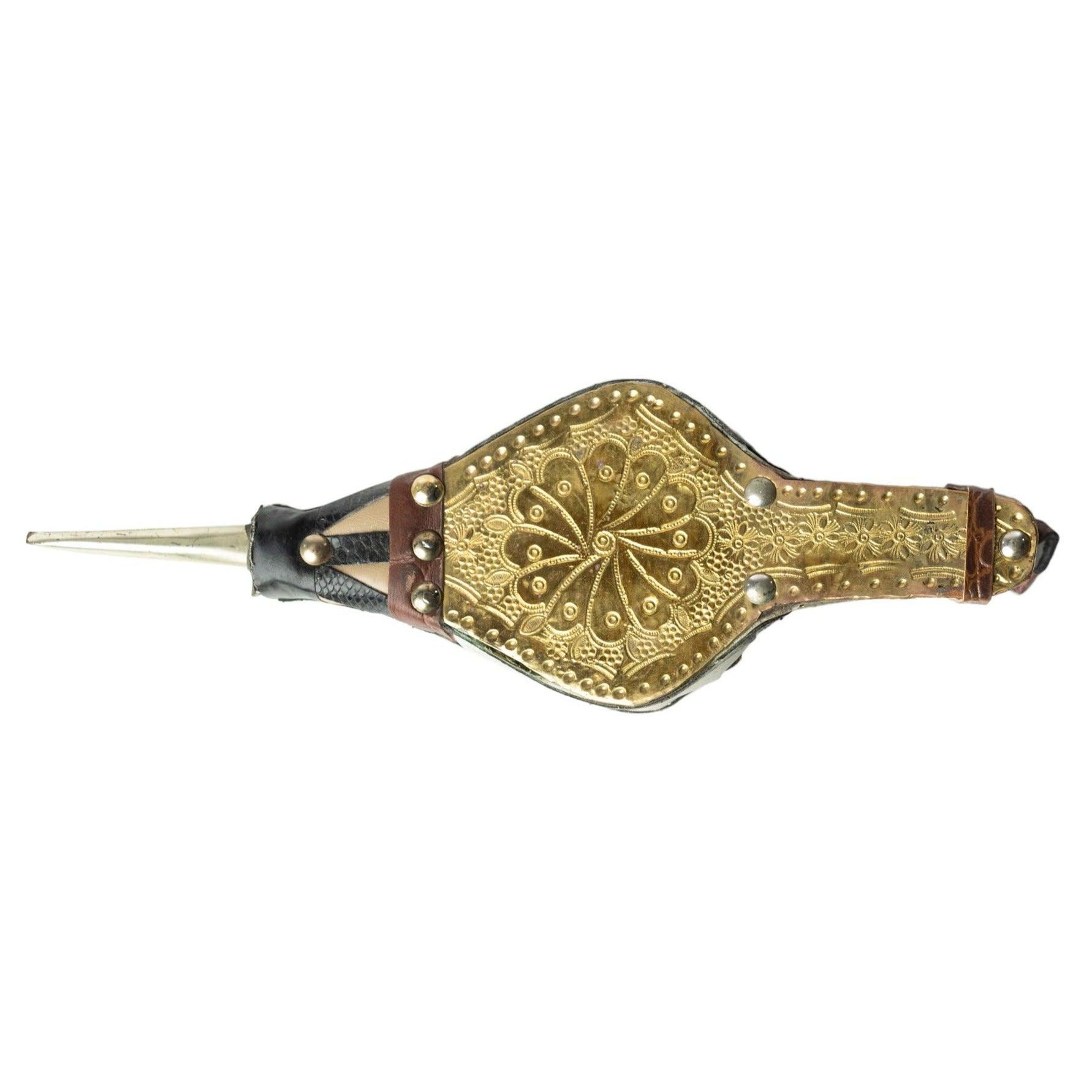 Decorative Moroccan bellows made of wood and alpaca. Crafted from wood and adorned with gilded alpaca. It can be used to light a fireplace. Alternatively, it can be hung on a wall as an Arabic decorative element.