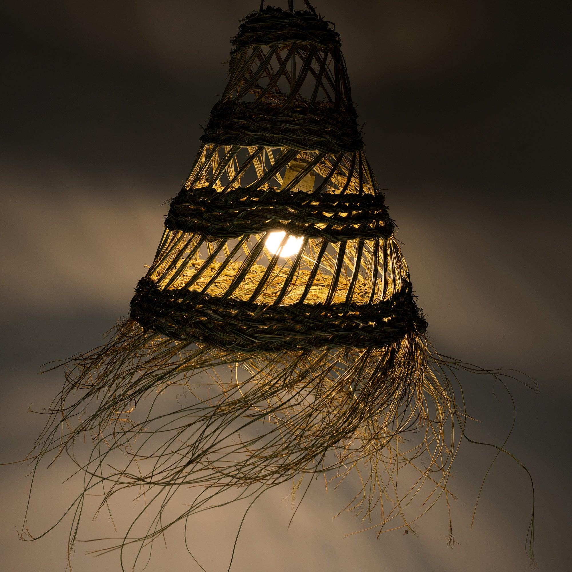 Ceiling lamp crafted from esparto grass, openwork for enhanced ambient lighting. Decorated with straw fringe, it adds a natural and fresh touch to any space. This esparto lamp is ideal for bedrooms and living rooms, rustic or minimalist settings.