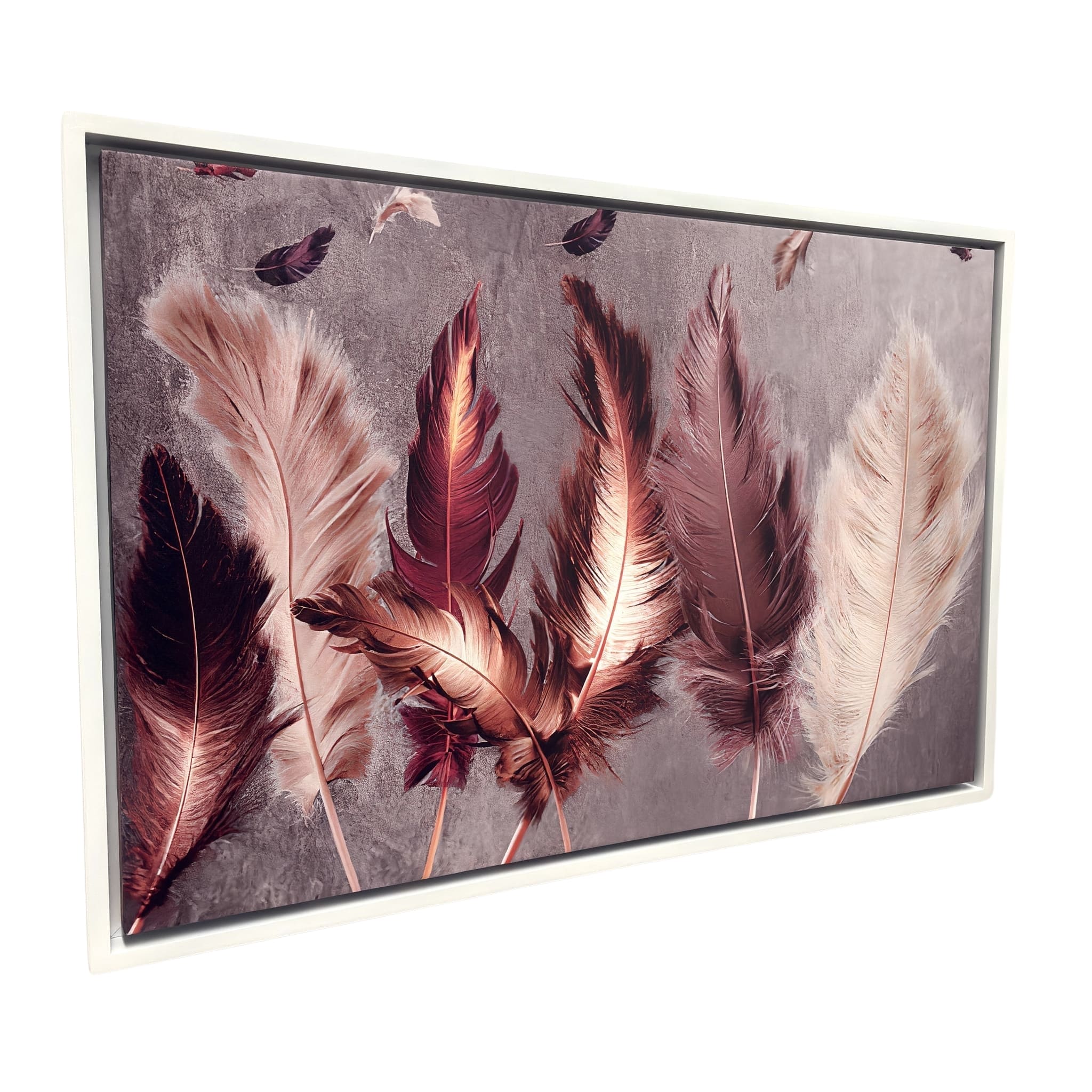 A nature-inspired print featuring colorful feathers, in a modern style with a neutral feel, set in a luxurious solid wood frame. Designed for minimalist, modern, or contemporary decor.