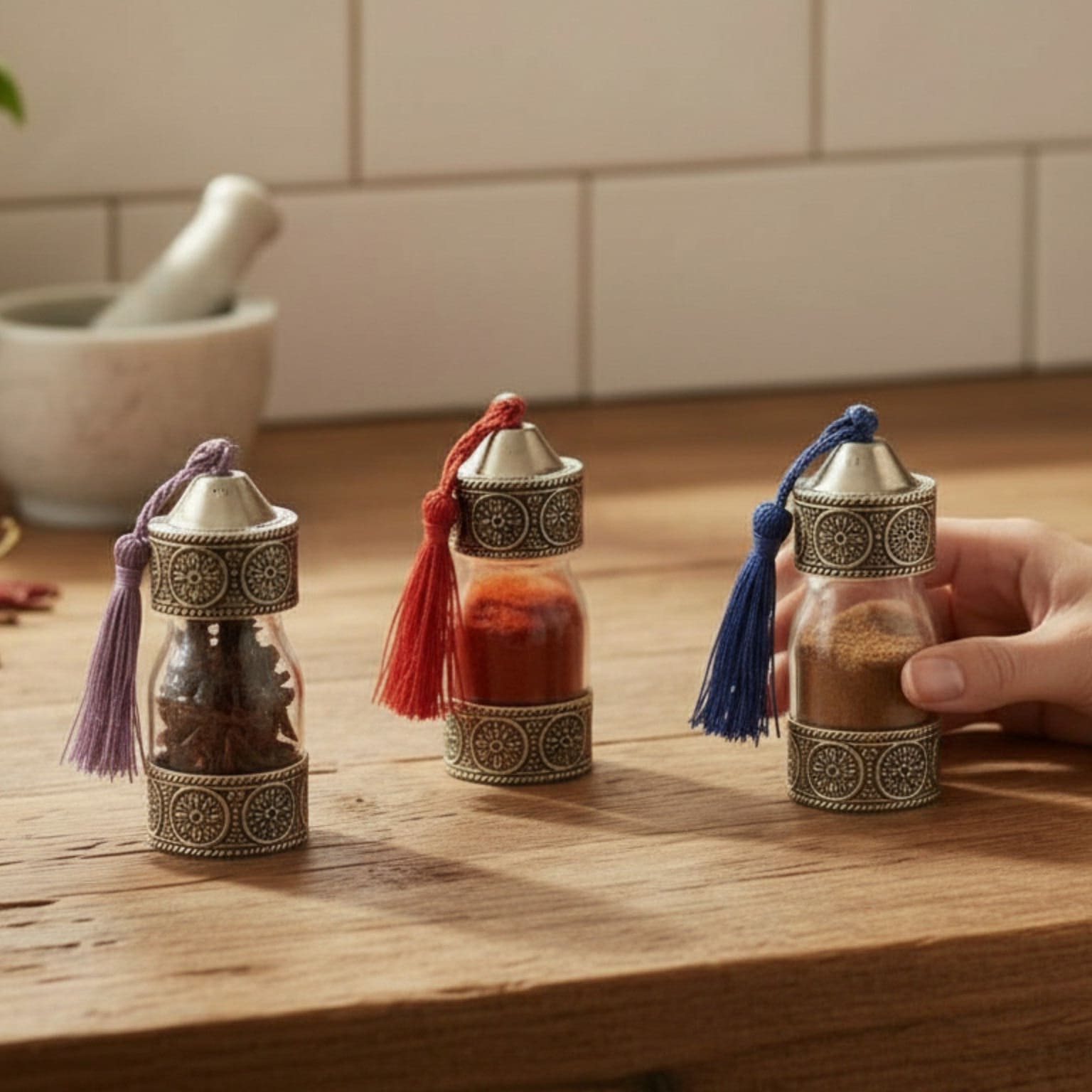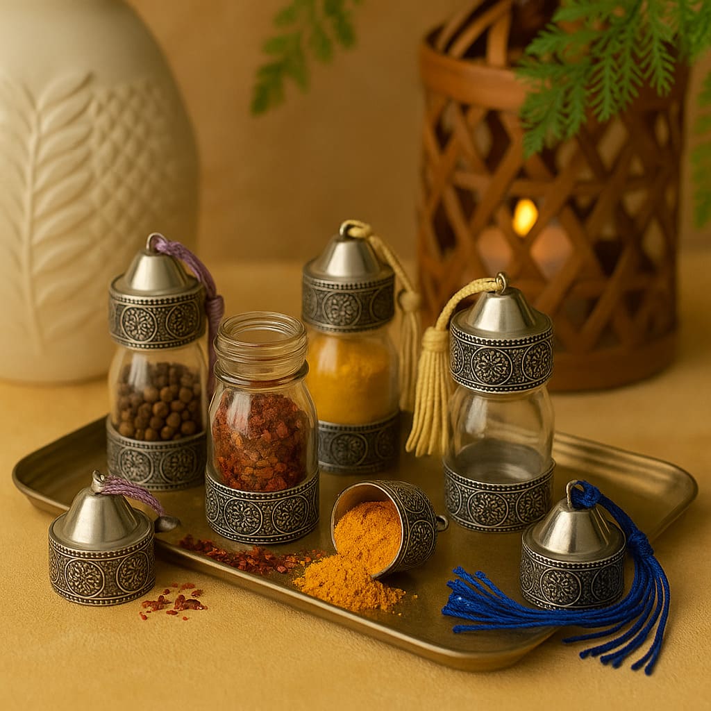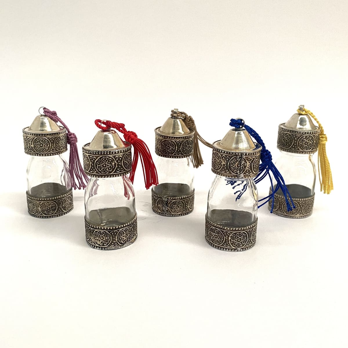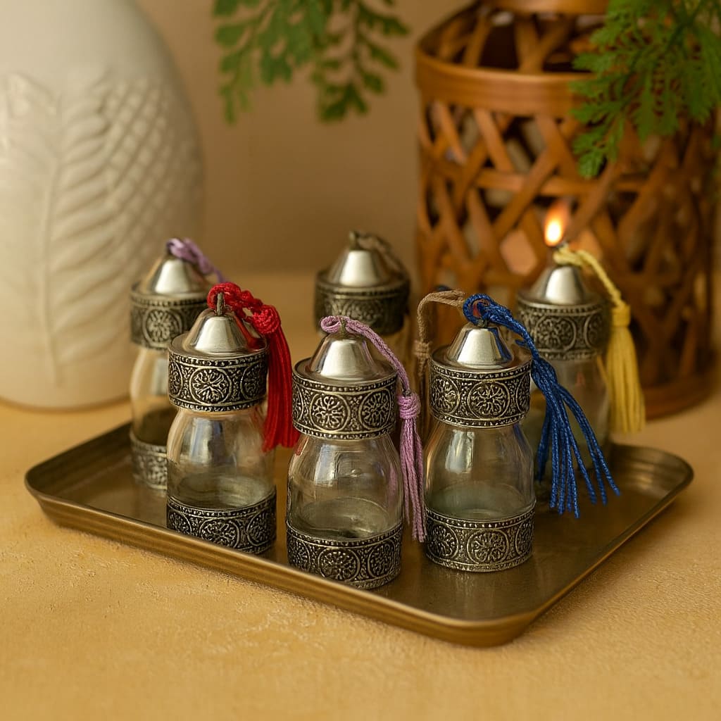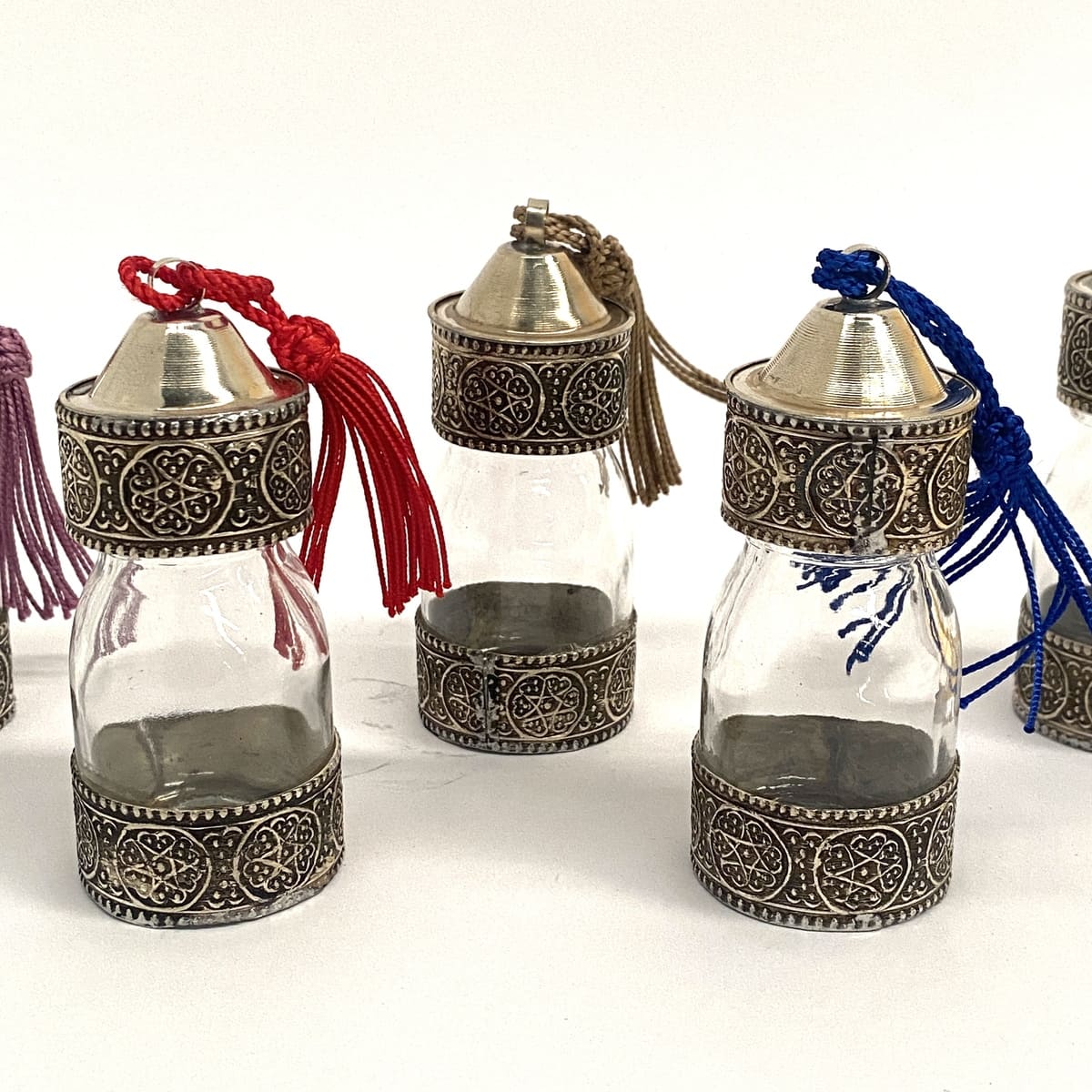 Hand-carved Arabic glass jar with alpaca details, ideal for spices or sauces. Add an Arabic touch to your kitchen with these modern containers and give your tableware a unique personality.